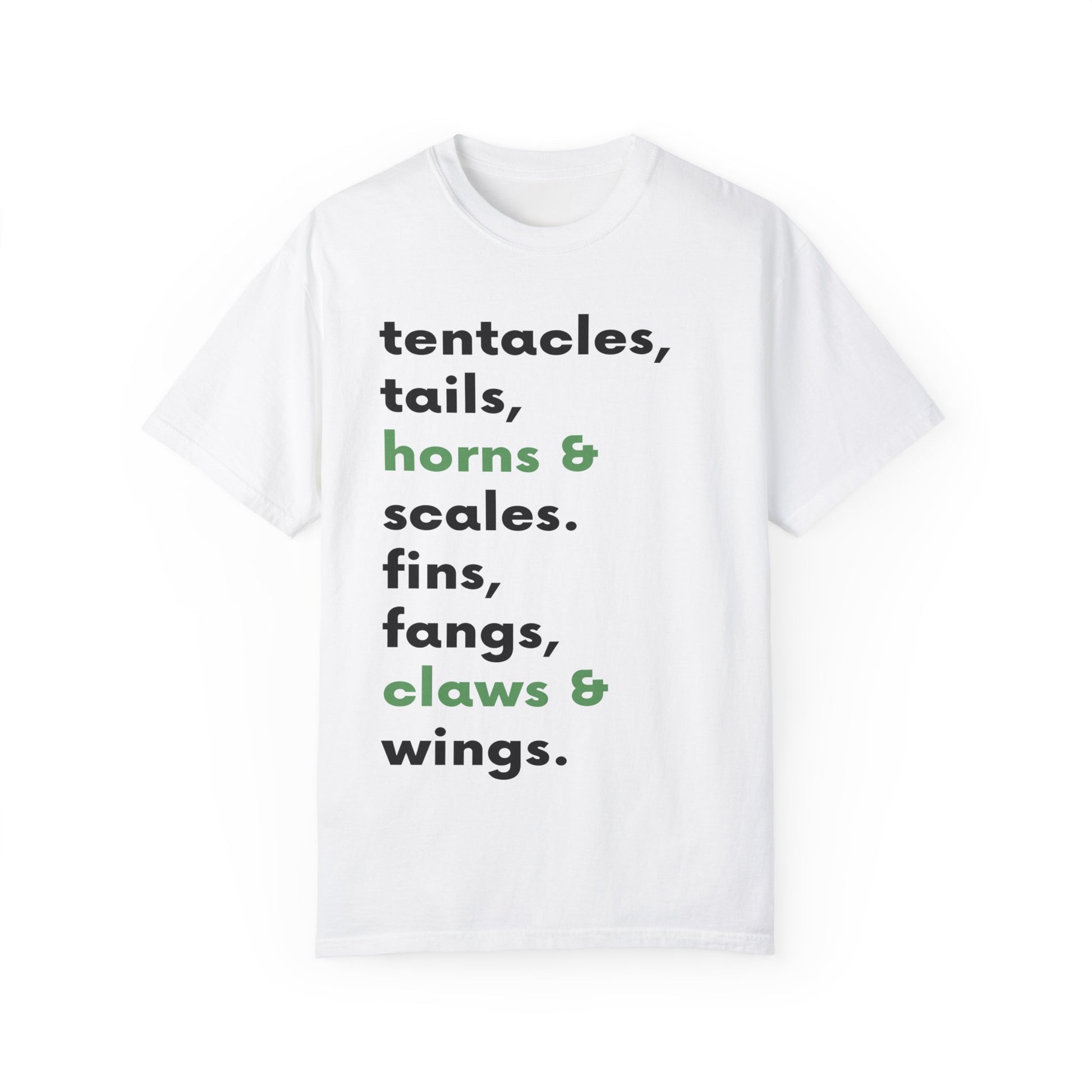 Fins, fangs, claws, and wings.