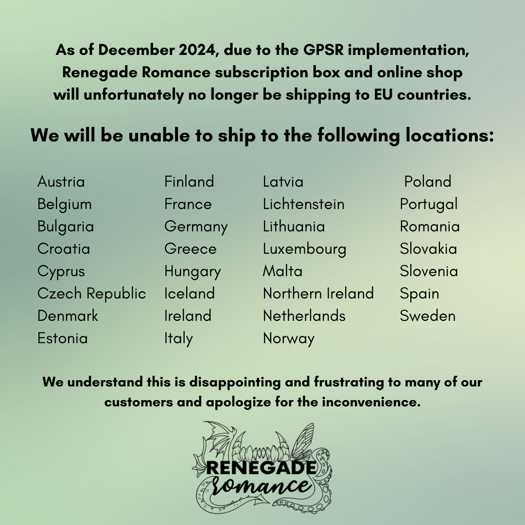PLEASE NOTE:  Any fees on delivery, such as but not limited to taxes, duties, and brokerage, are the responsibility of the receiver. Renegade Romance is not responsible for these fees, and will not provide a refund should you refuse delivery due to fees.